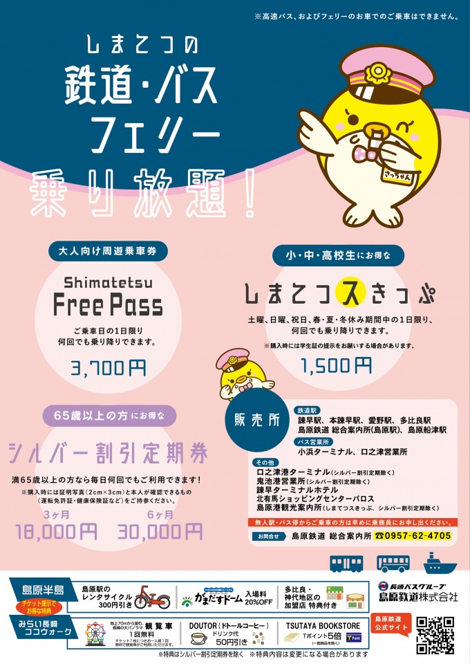 '시마테쓰 티켓'은 초-중-고등학생용이며, 주말과 공휴일과 당사가 지정하는 봄-여름-겨울 방학 기간 중 1일 동안 시마바라 철도의 철도-버스-페리를 무제한으로 이용할 수 있는 매우 저렴한 티켓입니다.